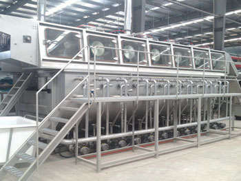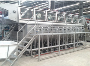 2、采用平幅預洗設計,通過堆置膨化、大流量循環(huán)噴淋,充分洗凈浮色和漿料,動態(tài)過濾系統(tǒng)將洗下的雜質和毛羽過濾后回水槽,大大提高水的重復利用率。