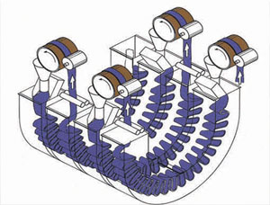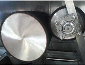 | 織物"U"型運行路線,配有軋車和噴淋嘴,節(jié)約空間,容布量大。 | 配有限位和防裹布裝置的繩狀軋車系統(tǒng),出軋車后配有環(huán)狀噴淋口。 |